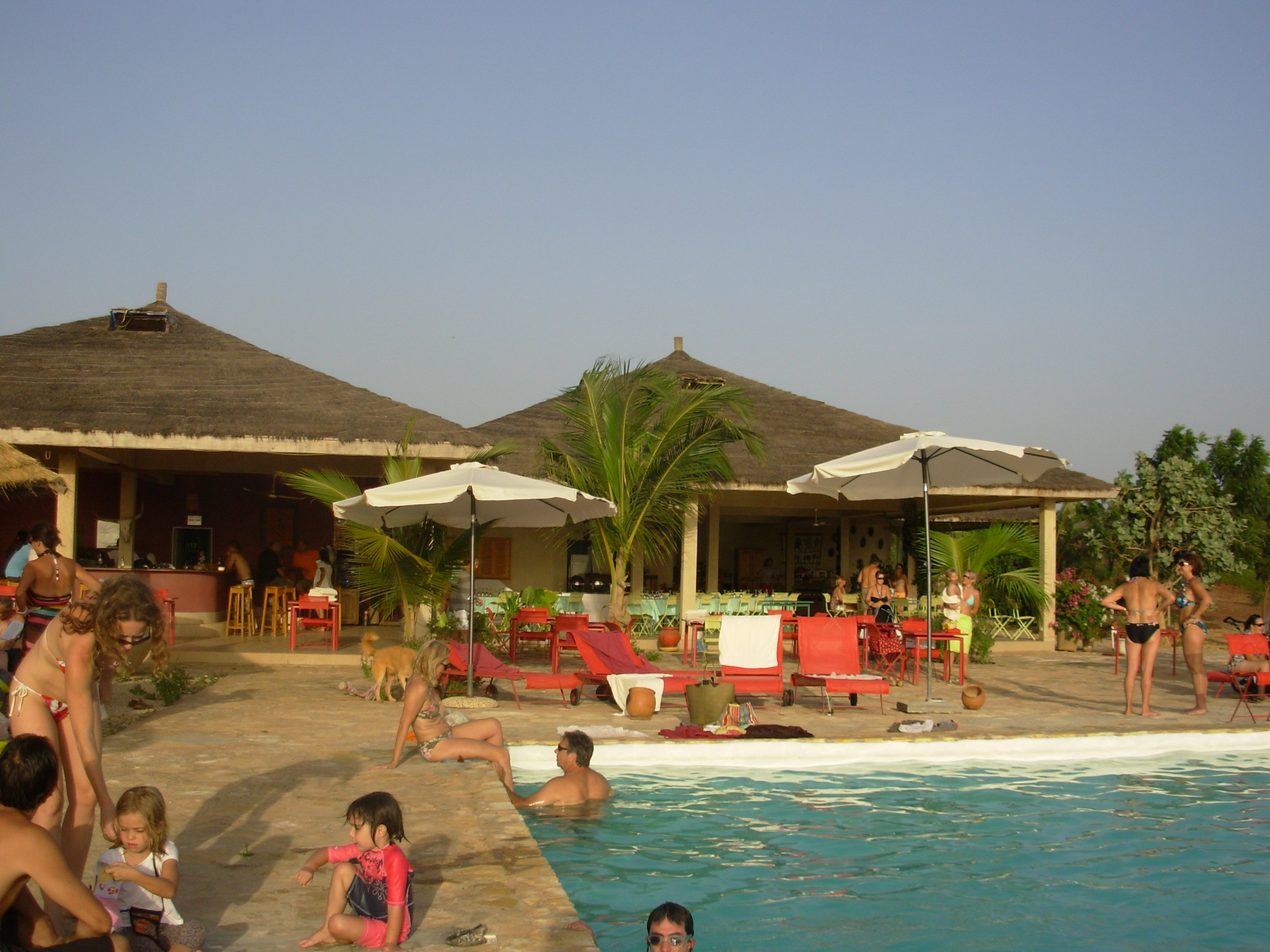 Half way through our three and a half hour venture we stopped for a drink. As far as the eye could see there were only trees, open sandy fields and marshes. The sun was just starting to make its way down towards the horizon when we pulled into a parking lot filled with SUV’s, Peugeots, and Volkswagens. Covered in dirt, dust and specks of dried mud, we removed our helmets, brushed off our clothes and walked through the thatched roofed bar only to discover the most surreal image of the entire day. Here, tucked away in the middle of nowhere, literally off the beaten path, was a hidden respite for dozens of European vacationers. They were lounging on tanning beds, frolicking in the pristine waters of an infinity pool, sipping cool fruit drinks under umbrellas and guzzling local beers at the bar. A long table was set in the restaurant with polished silverware and sparkling white plates. Waiters were busy wiping down chairs as a manager barked orders to his employees off in the corner.